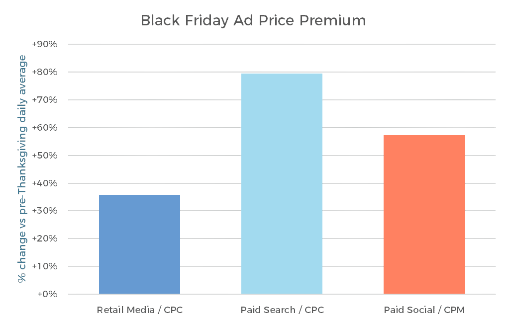 - Retail Media CPC was up 36% on Black Friday compared to the pre-holiday period, implying that the vast majority of ad spending growth came from increased clicks.