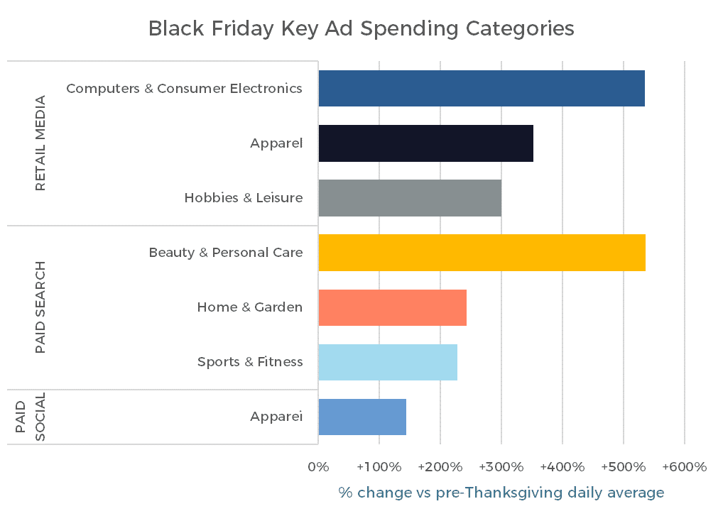 Retail Media saw the biggest ad spending spikes in Computers & Consumer Electronics (+535%), Apparel (+353%) and Hobbies & Leisure (+300%), all of which are traditionally strong categories for consumer sales events.