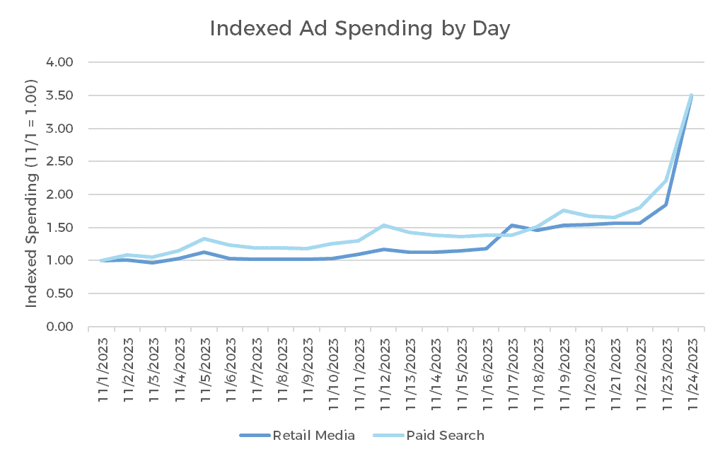 While Retail Media posted a bigger increase over the average than Paid Search, in both channels, the spending level on Black Friday was roughly 3.5X of what it was on November 1st. The difference was that search spending grew more gradually throughout the month, which drove the average higher, while retail media didn’t spike until about a week before the big holiday weekend.