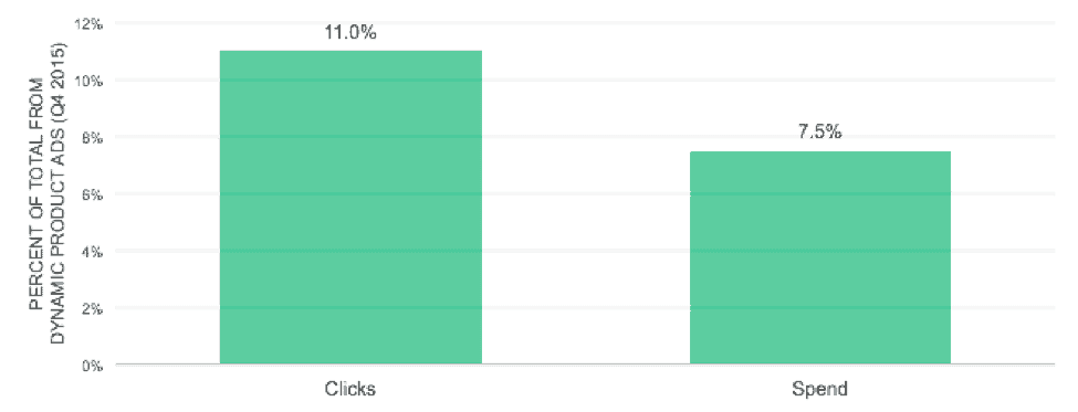 The carousel format has also been a key driver in both click volume and click-through rate for Dynamic Product Ads, helping push this ad type – which did not exist at the beginning of last year – up to 11% of total paid social clicks and 7.5% of total paid social spending in Q4 2015. The high click-through rate for the carousel DPA relative to other ad types shown in the first chart, including the single-link variety of the DPA, demonstrates the higher level of engagement for this type of ad. It should be noted, however, that some of this CTR advantage may be structural, as there are multiple places for the user to click within a single impression.