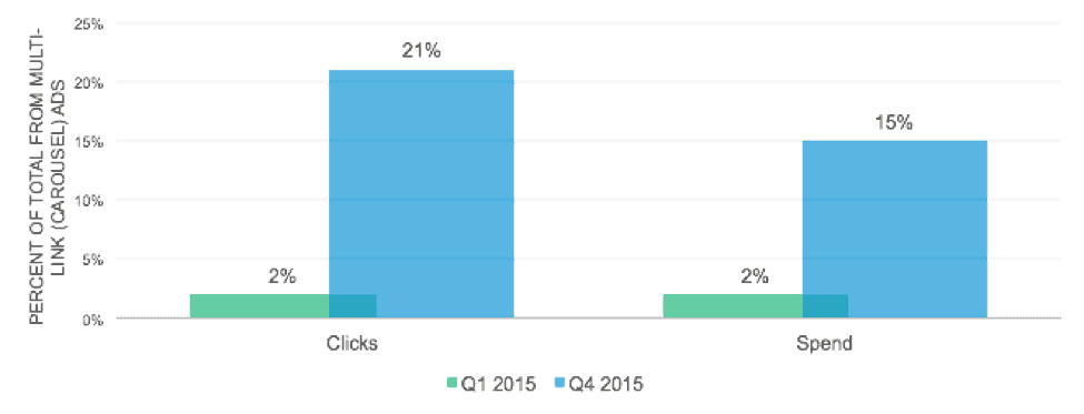 Carousel ads give marketers a canvas to tell a story with more links and image tiles. This opportunity for extended storytelling appealed to consumers and marketers alike as both clicks and spend grew throughout 2015 – from 2% of both clicks and spend in Q1 to 21% and 15% in Q4, respectively.