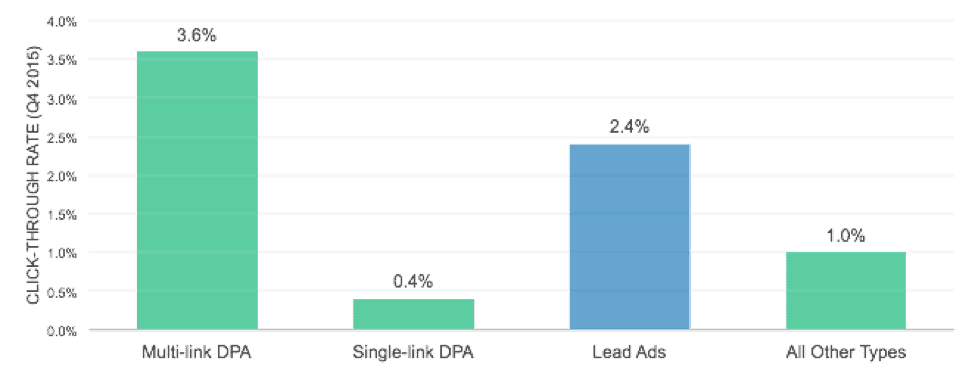 Early results from Skai show that Lead Ads came out of the gate strong, garnering a favorable click-through rate (CTR) in Q4 relative to other social ad types, second only to carousel (multi-link) Dynamic Product Ads (DPA).