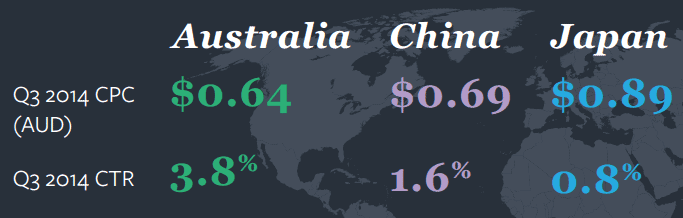 Drilling down even more, we see performance vary from country to country in APJ. As shown in the chart below, Australia continues to show strong click-through rates for the region whereas the low CTR and high CPC in Japan suggest that marketers there are using paid search for branding rather than direct response.