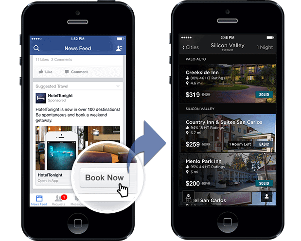 So, Facebook took its mobile app ads to the next level – moving beyond installs to app engagement and conversion. With this new ad type, you can deep-link directly to specific content within your app – whether it is an offer for online purchasers, trending flight and hotel packages, new game levels, or an updated playlist. This ad type also features a prominent call to action, such as Shop Now, Book Now, or Play Game.