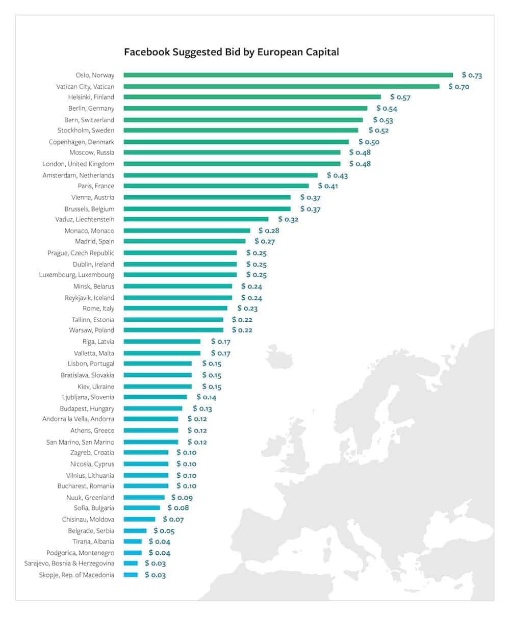 In a previous post, I explored the top 10 most expensive U.S. cities to target on Facebook and found that San Francisco took the top spot. This time around, we looked at European capitals and found that this honor goes to Norwegian city Oslo, followed by the Vatican City, Helsinki, and Berlin.
