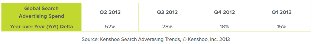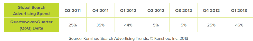 2012 was a very healthy year for paid search with an increase of 32% Year-over-Year (YoY) from 2011. So, the fact that Q1 spend was up 15% over 2012 indicates a great start for paid search in 2013.