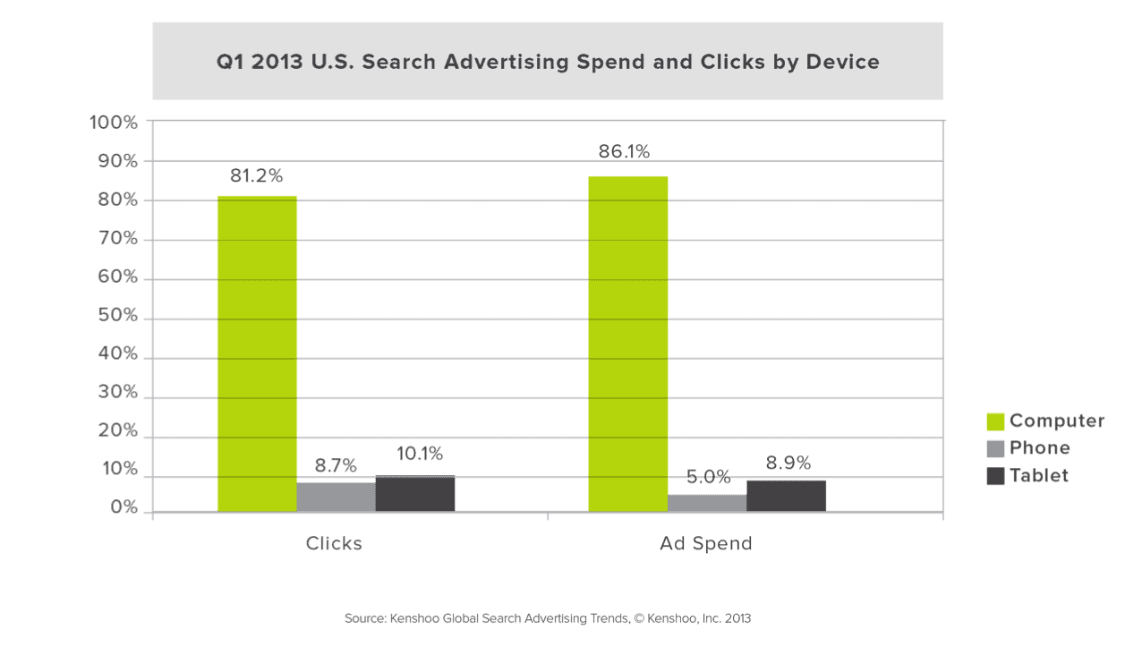 With Enhanced Campaigns bringing so much recent attention to mobile paid search, there has been quite a bit of interest in how different devices are being managed by search marketers. In the U.S., paid search activity on computers still made up a majority of the clicks (81.2%) and spend (86.1%) in the first quarter of 2013. Interestingly though, whereas tablets barely beat out phones in clicks (10.1% vs. 8.7%), spend on tablets (8.9% of total search budgets) was almost twice as high than with phones at just 5% of U.S. paid search budgets.