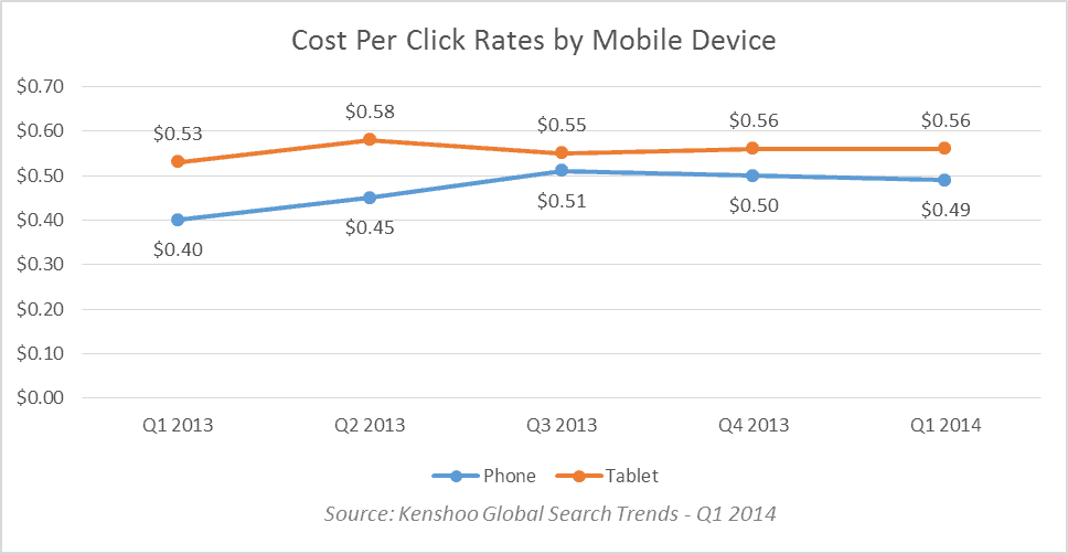 Turning to cost-per-click for mobile devices, tablets have seen a slight premium over phones for the duration of this data set. Overall, prices have mostly flattened since Q3 of last year across both devices, after increases for phone in early 2013 and some fluctuation for tablet. Year-over-year, Tablet CPC is up 6% and Phone CPC is up 23%.