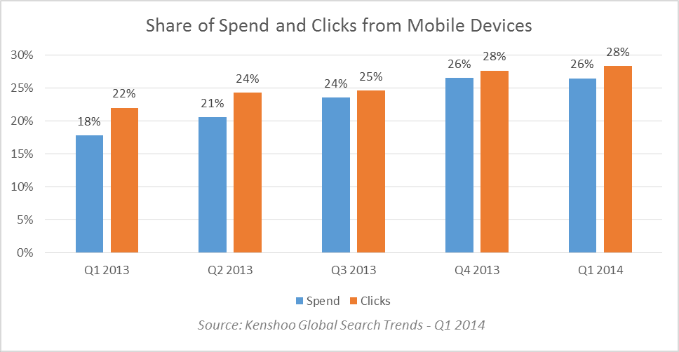 As the proliferation of smartphones and tablets continues unabated, search marketers are devoting more of their resources to these devices. In the first quarter of 2013, mobile share of clicks stood at 22% globally, while the percentage of search spend was 18%. This year, those numbers increased to 28% and 26%, respectively.
