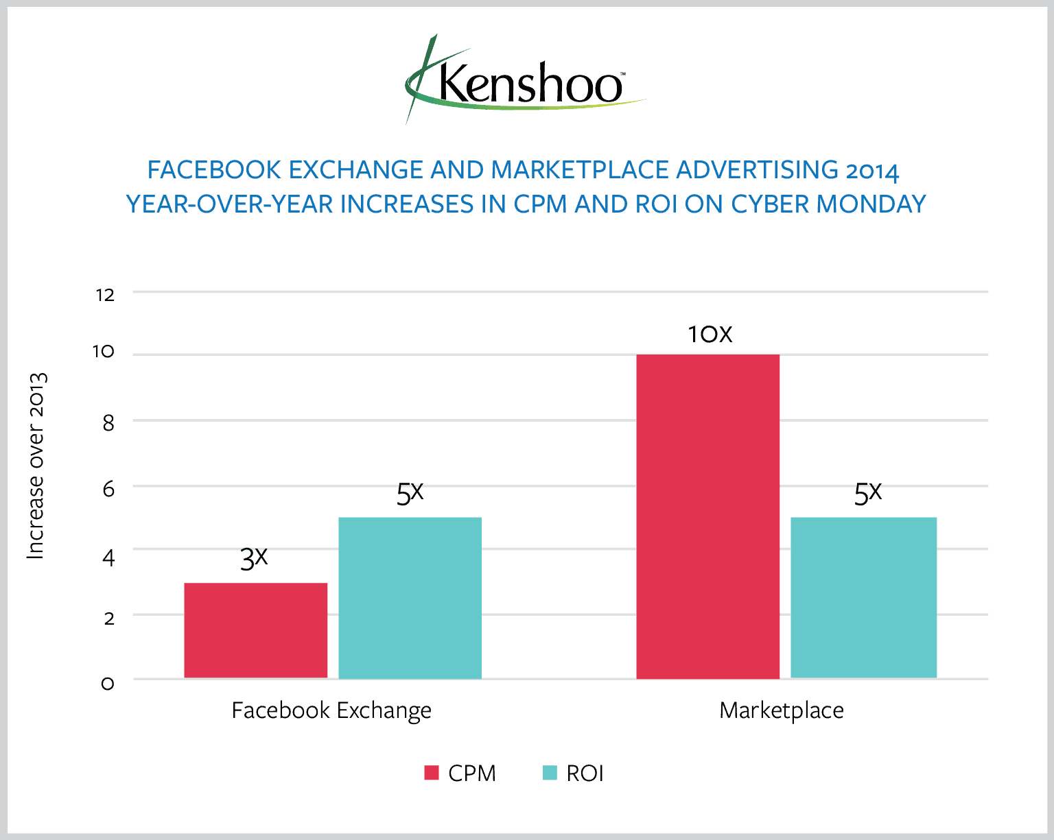 While overall Facebook advertising performance increases throughout the month of November in 2014 were staggering, the same metrics were even more compelling this year on Cyber Monday. As shown in the chart below, both FBX and Marketplace drove substantial return on investment – 5X greater than ROI on Cyber Monday in 2013. This year, FBX generated greater efficiency than Marketplace with CPM increasing by 3X and 10X respectively, likely due to the changes in Marketplace ads mentioned above.