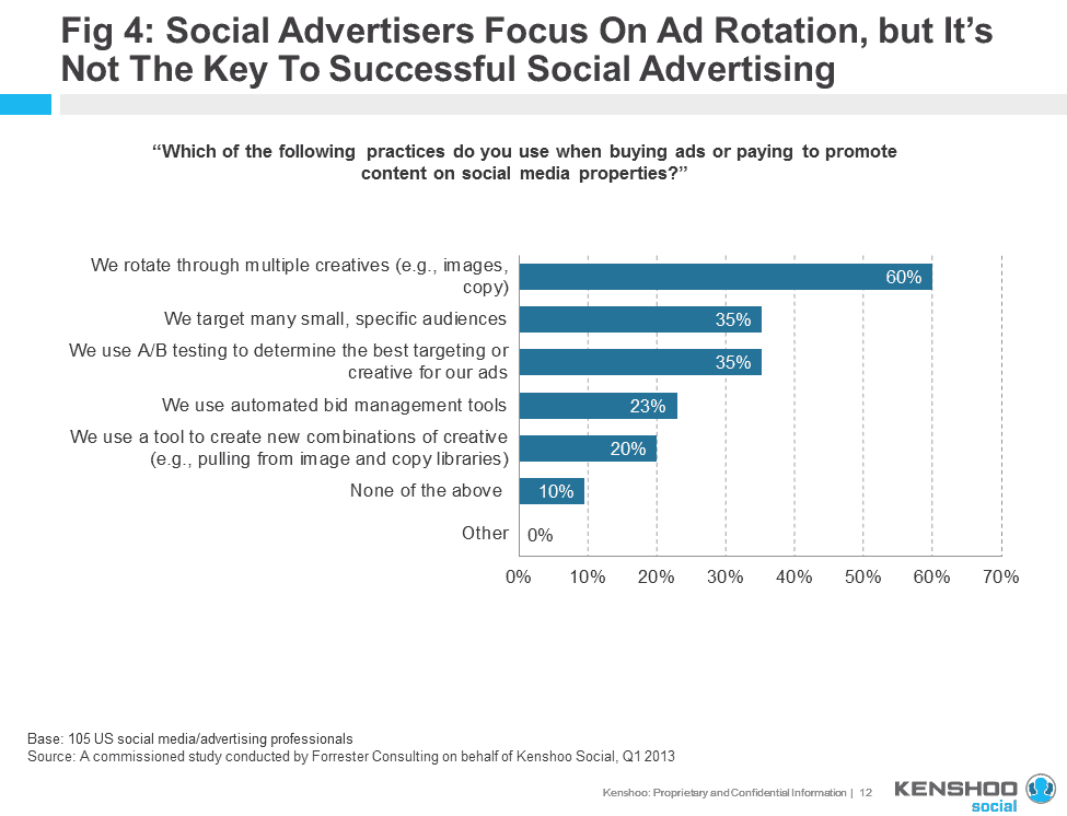 One of the key findings is that marketers have yet to fully take advantage of the advanced targeting offered on these social advertising platforms. Although 60% of respondents revealed that they use ad rotation as an optimization tactic, only a third reported targeting small, specific audiences or using A/B testing to determine the best targeting or creative. Less than a quarter (23%) of those surveyed use automated bid management tools.